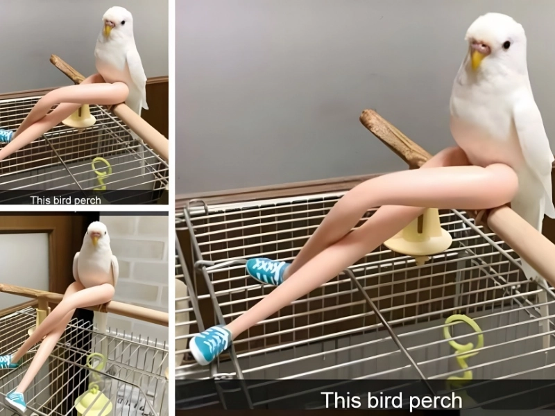 This bird, positioned on a branch with Barbie doll legs fastened, produces a comical illusion. The bird appears oblivious to the prank, making the moment even more humorous.