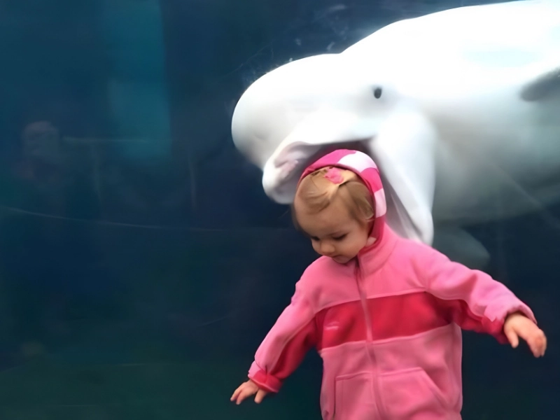 This dolphin appears ready for a meal, and the child is completely oblivious. Fortunately, thick glass separates them.