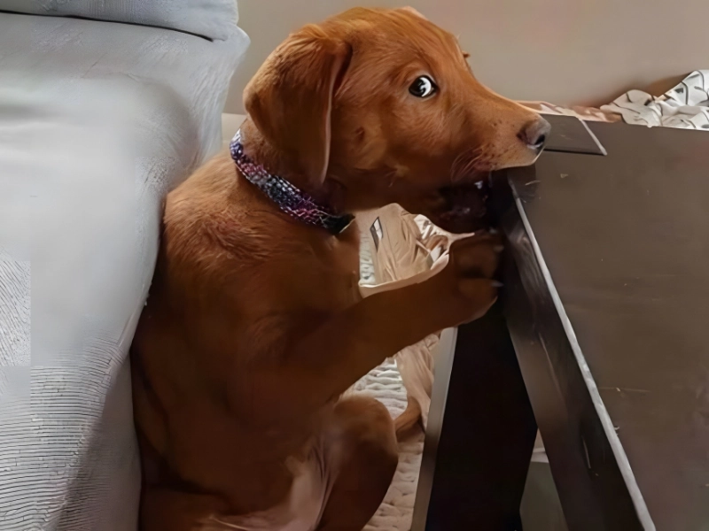 Dogs are masters at appearing blameless. In this humorous photo, a puppy is discovered chewing on a table, casting his owner a sheepish look while acting as though another dog is responsible.