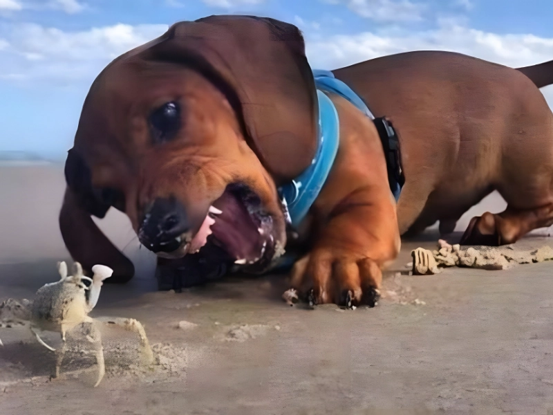 This resolute dachshund confronts a small crab. On a leash, the dog attempts to appear fierce, while the crab lifts a claw in protection.