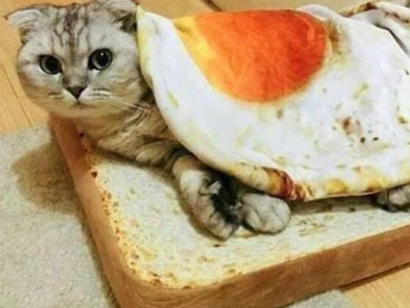 Immersed in afternoon sunlight, Whiskers the cat reclined in the kitchen on a pillow resembling a slice of bread. The pillow embraced her shape, making her appear like a living loaf. Her humans discovered endless entertainment in her bread-like position, laughing at the spectacle. Whiskers purred happily, absorbed in the warmth and comfort. As the sunlight flickered around her, she presided as monarch of her bread-shaped throne, a representation of coziness and the uncomplicated pleasures of life.