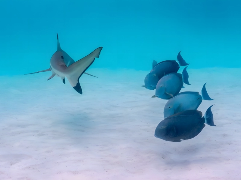 This impressive shot shows four surgeonfish trailing a black-tip reef shark in Moorea, French Polynesia. In the ocean, sharks rule, and these surgeonfish know to stay still when one is near. The image subtly explores themes of power and order, landing it in the 2023 Comedy Wildlife collection.