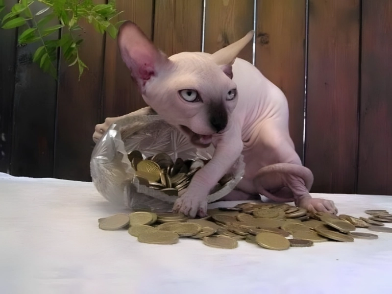 This photo needs backstory. Why is this cat collecting coins? Real money or tokens? And why is it hairless? The real question is: would you try to take the coins or just walk away?