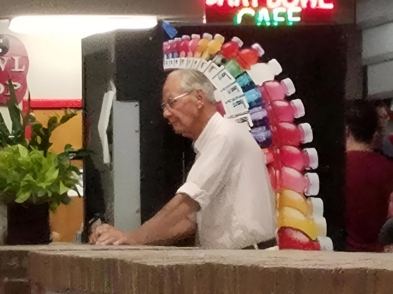 Freezers in convenience stores serve not only as storage but also as creative marketing spaces. They provide a fun backdrop for candid photos that combine humor and product placement. One memorable image shows an elderly man playfully posing as a tribal chief, his “headdress” made of drink bottles.