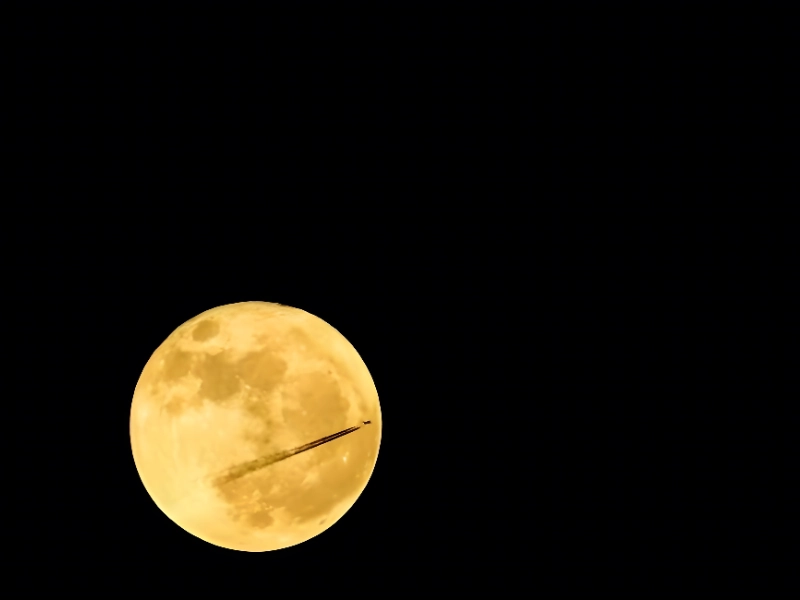 As the moon dominates the sky, the fleeting trail from the plane enhances its brilliance. This magical scene invites viewers to dream of witches flying across the night, silhouetted against the glowing moon.